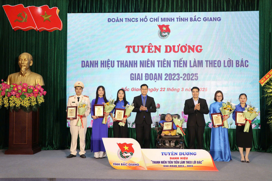 Đại diện lãnh đạo Ban Tuyên giáo và Dân vận Tỉnh ủy, Tỉnh đoàn Bắc Giang trao danh hiệu "Thanh niên tiên tiến làm theo lời Bác" giai đoạn 2023 - 2025 cho các cá nhân.