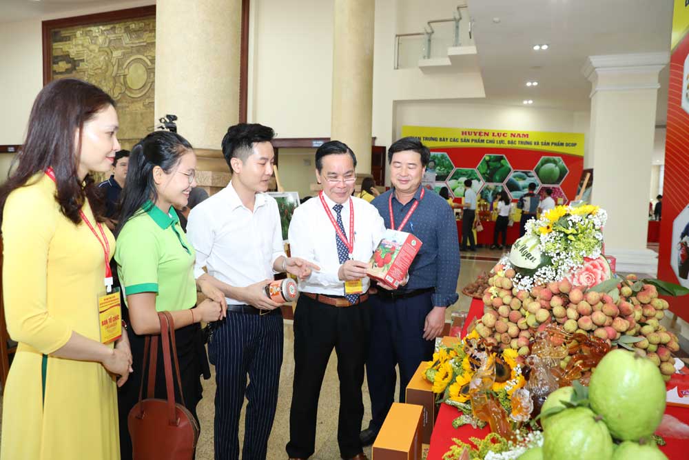 Các đại biểu thăm gian trưng bày vải thiều và các sản phẩm đặc trưng của huyện Lục Ngạn. |