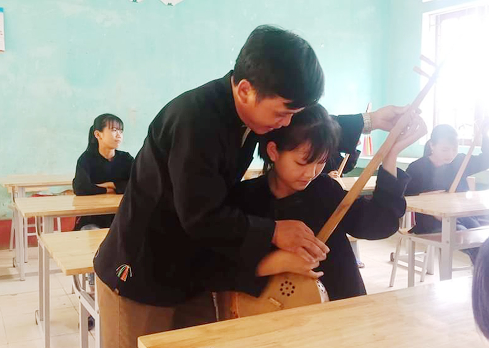 Nghệ nhân Lục Văn Tích truyền dạy hát Then, hướng dẫn học sinh chơi đàn tính.