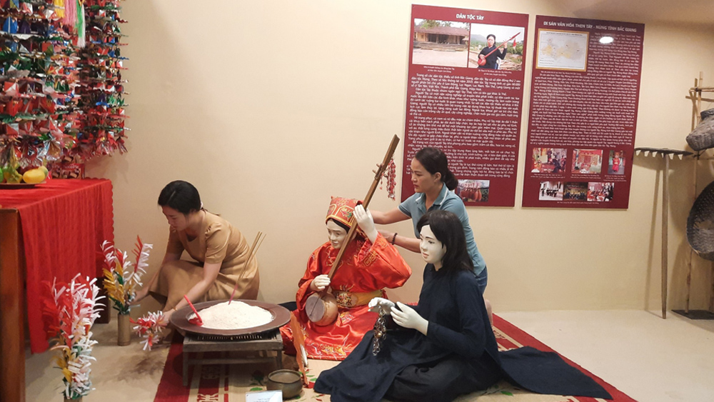 Nhân viên Bảo tàng tỉnh Bắc Giang trưng bày mô hình nghi lễ cúng Then của dân tộc Tày.