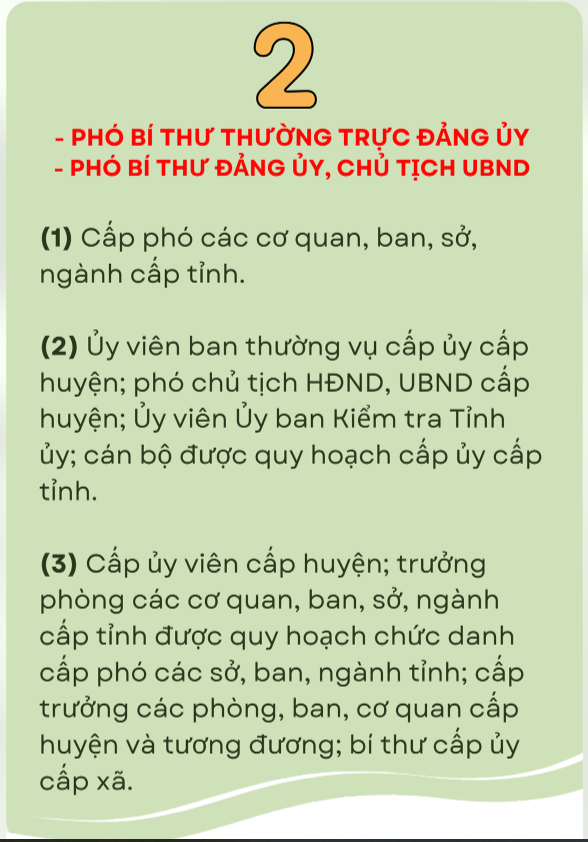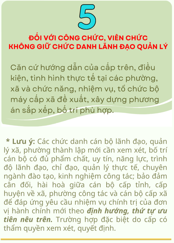 Ngày 8/5/2025, Ban Thường vụ Tỉnh ủy Bắc Giang ban hành Kết luận số 359-KL/TU về việc hướng dẫn xây dựng phương án nhân sự cấp ủy và định hướng bố trí, sắp xếp cán bộ lãnh đạo, quản lý cấp xã thành lập mới. Trong đó, định hướng bố trí cán bộ lãnh đạo, quản lý xã, phường thành lập mới như sau: