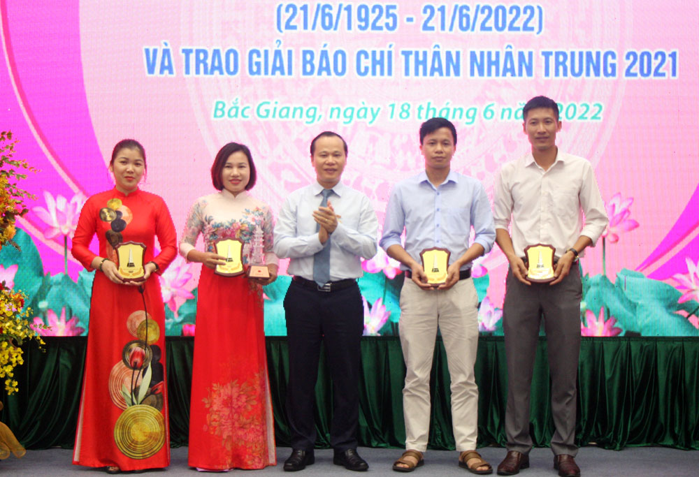Cũng dịp này, Ban tổ chức trao thưởng cho các tác giả, nhóm tác giả với 32 tác phẩm đoạt giải báo chí Thân Nhân Trung năm 2021. Tác phẩm: “Chiến dịch tiếp tế cho 67.000 công nhân ở tâm dịch” (loạt 3 bài, báo in) của tác giả Trần Đức (Báo Bắc Giang) và tác phẩm truyền hình “Bắc Giang vì cả nước - Cả nước vì Bắc Giang” của nhóm tác giả Đức Đạt, Thu Thủy (Đài Phát thanh và Truyền hình tỉnh) xuất sắc đoạt giải A giải Báo chí Thân Nhân Trung năm 2021.