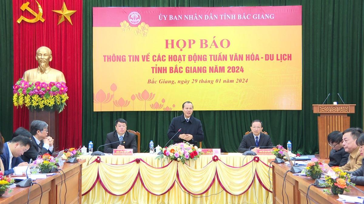 Tuần Văn hóa - Du lịch tỉnh Bắc Giang năm 2024, với chủ đề “Linh thiêng Tây Yên Tử”, diễn ra từ ngày 06 ngày, từ ngày 20/02/2024, đến ngày 25/02/2024 (tức từ ngày 11 đến ngày 16 tháng Giêng, năm Giáp Thìn) tại Khu du lịch tâm linh - sinh thái Tây Yên Tử huyện Sơn Động; chùa Vĩnh Nghiêm huyện Yên Dũng và một số huyện, thành phố trong tỉnh. Sáng 29/1, UBND tỉnh Bắc Giang tổ chức họp báo thông tin về các hoạt động Tuần văn hóa – Du lịch với sự chỉ trì của đồng chí Mai Sơn- Phó Chủ tịch Thường trực UBND tỉnh. Cùng dự có lãnh đạo Sở Thông tin & Truyền thông, Sở Văn hóa thể thao & Du lịch, lãnh đạo các huyện, các cơ quan thông tấn báo chí trung ương và địa phương.