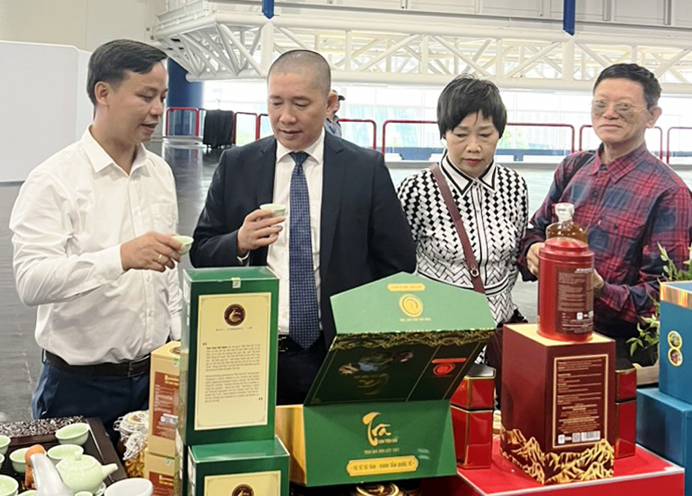 Đại diện Công ty cổ phần Sâm Nam núi Dành King GinSeng giới thiệu các sản phẩm chế biến từ sâm Nam tại Hoa Kỳ. |