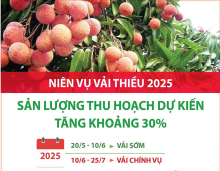 bientapvien gửi vào T3, 05/13/2025 - 16:46Niên vụ vải thiều năm nay được đánh giá trúng mùa với sản lượng thu hoạch dự kiến đạt 303.000 tấn, tăng khoảng 30% so với năm ngoái.