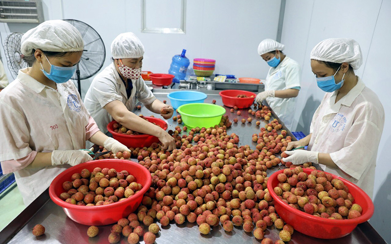 Chế biến vải thiều xuất khẩu sang thị trường châu Âu tại huyện Lục Ngạn. (Ảnh ÐẶNG GIANG)